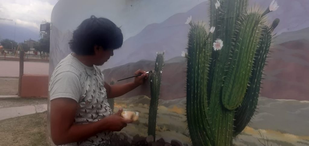 Para Amado este tipo de obras son una cotidianeidad. Las realizó en la Parroquia Nuestra Señora del Rosario con una escena bíblica que adornó el baldaquín central. Para la plazoleta del Padre”Chifri” los cactus, los cerros, el cielo límpido del lugar, la aridez de sus tierras están reflejadas en este nuevo mural realista.