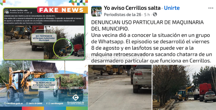 Una fake news circuló en redes sociales acusando al municipio de San José de los Cerrillos de utilizar una máquina retropala excavadora para “tareas particulares”. La falsa denuncia, que se viralizó en un grupo de WhatsApp y luego fue replicada por una página de Facebook, creada hoy mismo, quedó desmentida, aunque algunos usuarios de redes menos despiertos llegaron a replicar la fake.