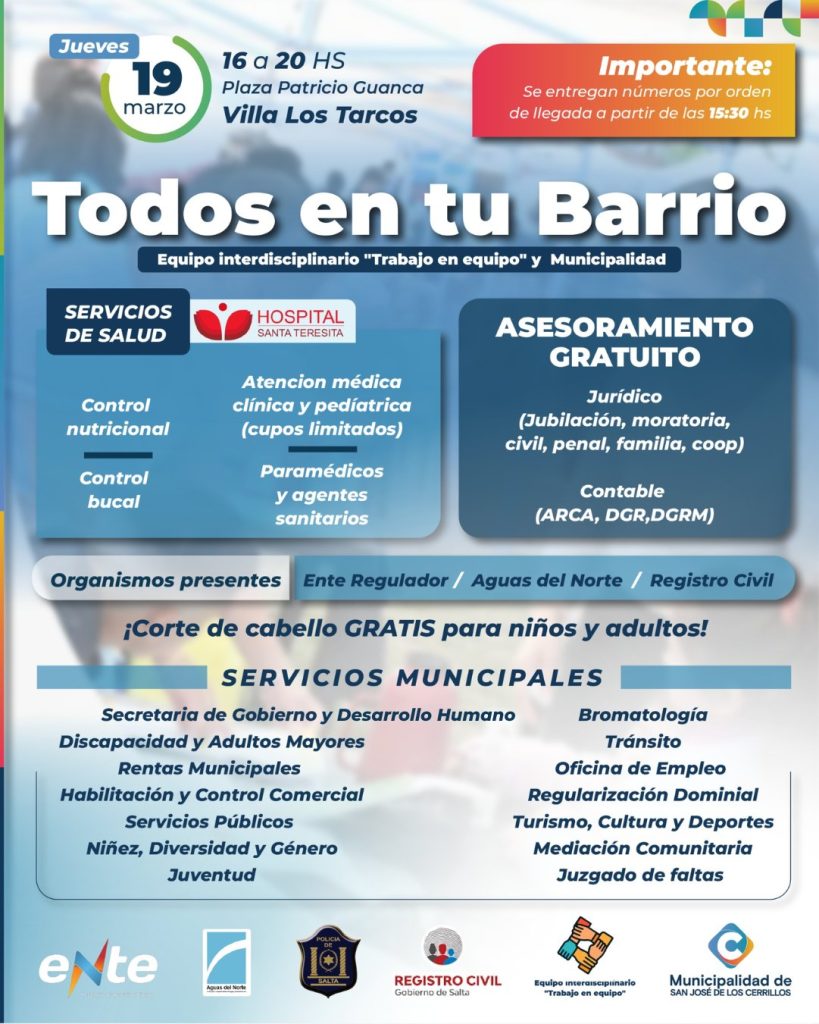 En el área de salud, el Hospital Santa Teresita estará presente con atención clínica y pediátrica, aunque con cupos limitados, sumando además controles odontológicos, vacunación y la labor de agentes sanitarios. El operativo también incluirá la participación de organismos como el Ente Regulador, Aguas del Norte y el Registro Civil, lo que permitirá resolver gestiones administrativas sin necesidad de trasladarse a otras oficinas.